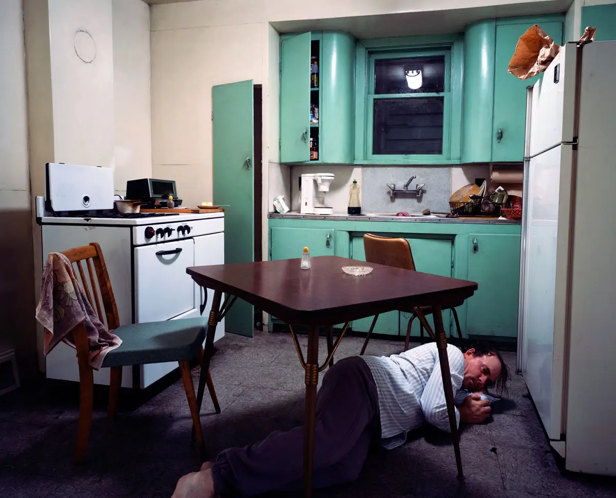 Les photographies de Jeff Wall pourraient être qualifiées de « photographies de cinéma », dans la mesure où elles résultent de mises en scènes minutieusement calculées, pour un résultat final donnant l’illusion d’une photographie documentaire ou un cliché tiré de la « réalité ».
