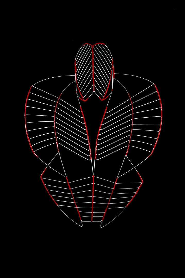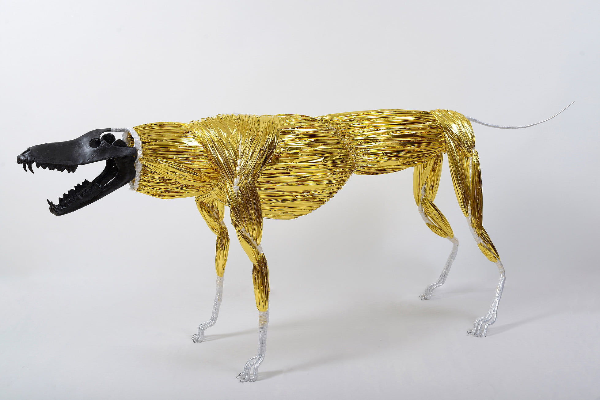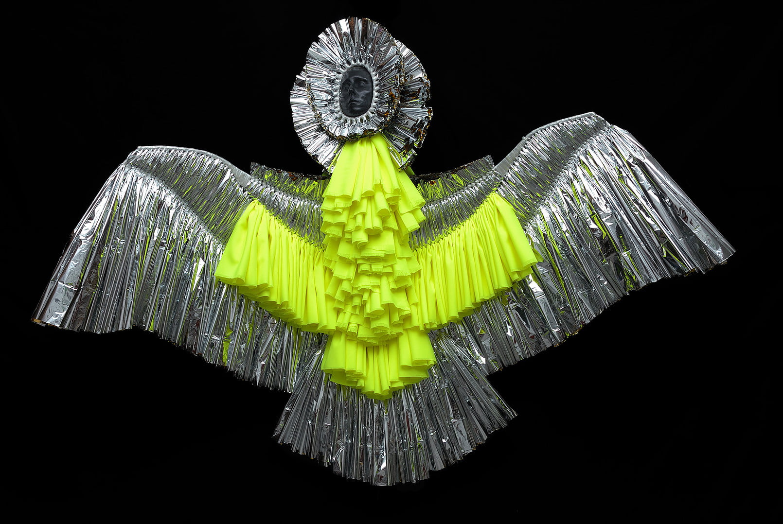 Art d’une guerre contemporaine qui trouve ses racines dans les pratiques ancestrales, le sculpteur se fait sorcier invoquant les esprits de ses dieux noirs, de Martin Luther King à Jimmy Hendrix (« The Solar Fighting Bros »/ »The Furious Snakes »). Il puise son inspiration aux origines, alliant guerre et sacré. Les figures de son armée thériomorphe, écorchées dont les plumes se mêlent au filandreux du muscle, évoquent les parures des guerriers Massai ou les costumes de Navajos “Skinwalkers”. La tension anatomique est lisible dans la précision de la structure, elle sublime le matériau profane. Les regards fixent le lointain, nous montrent une autre voie.