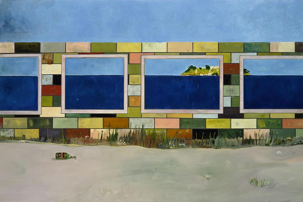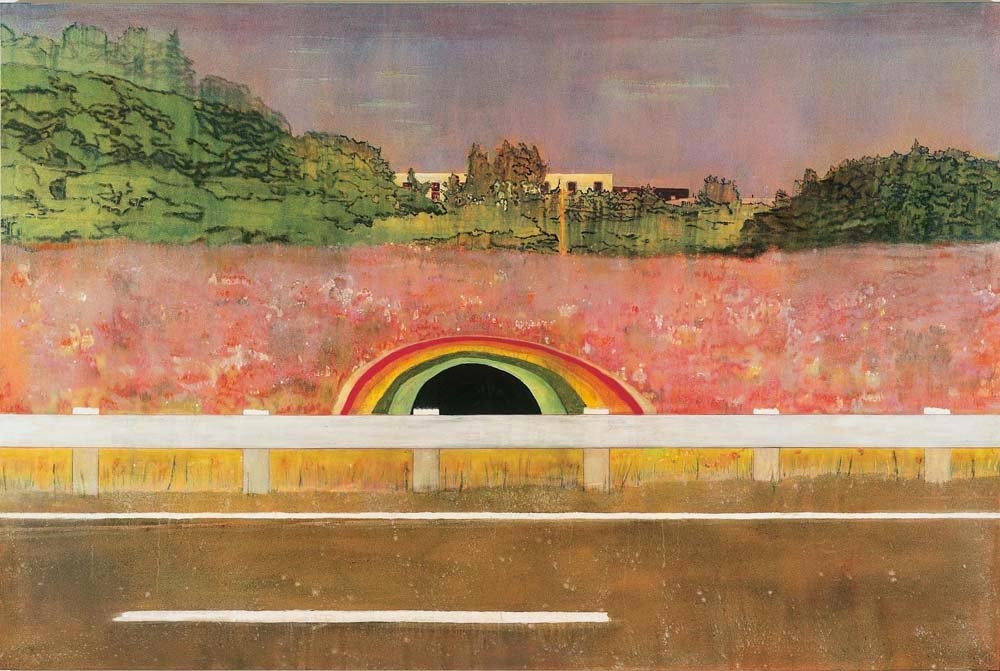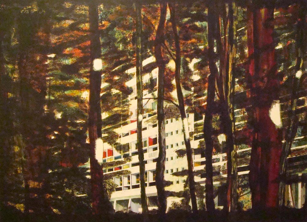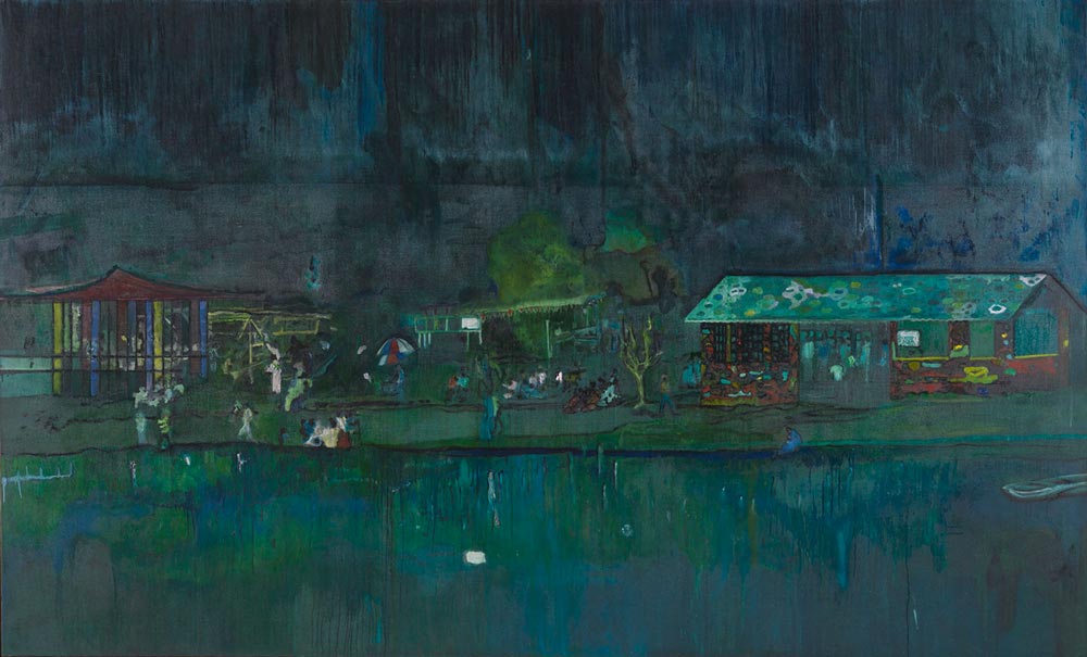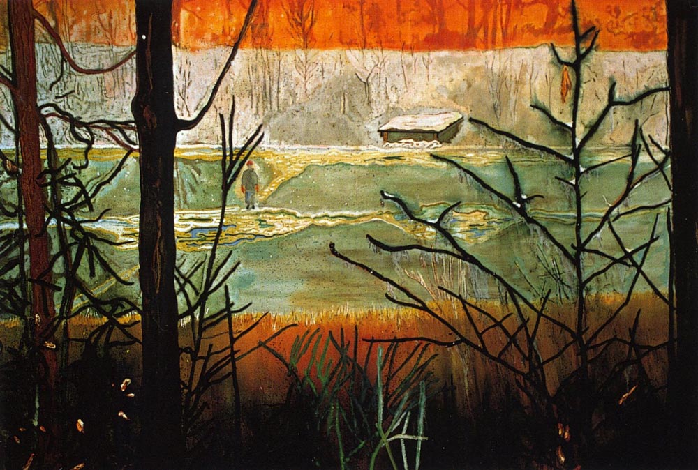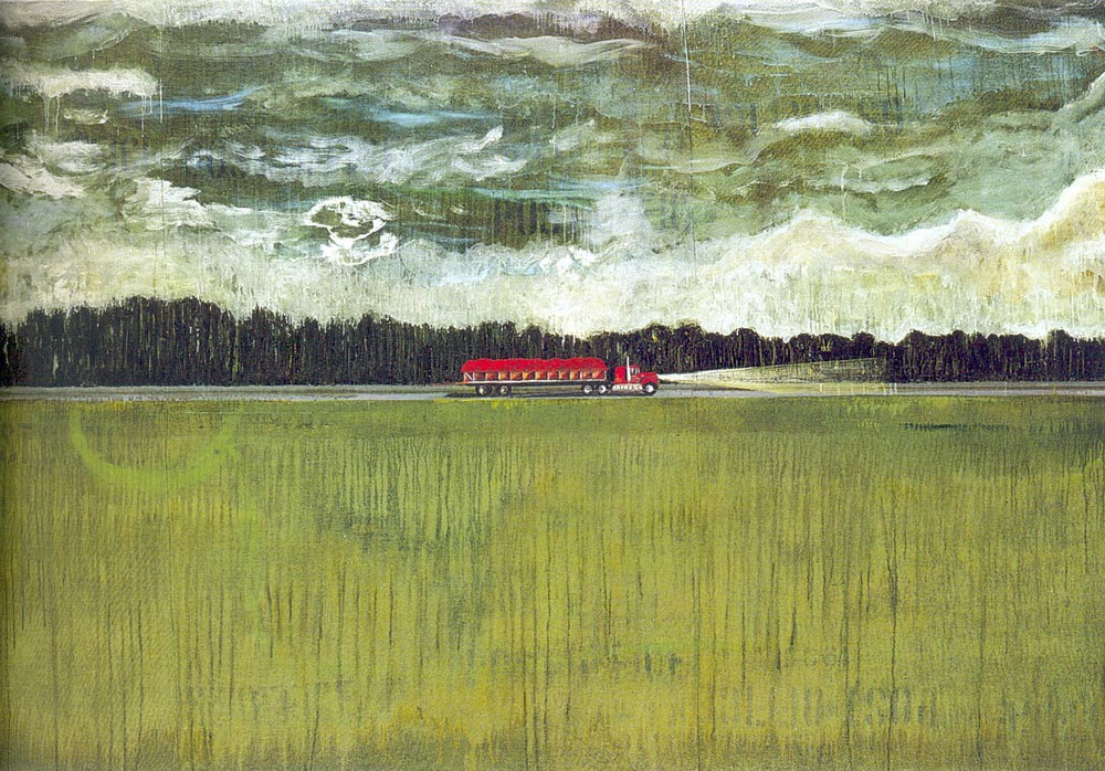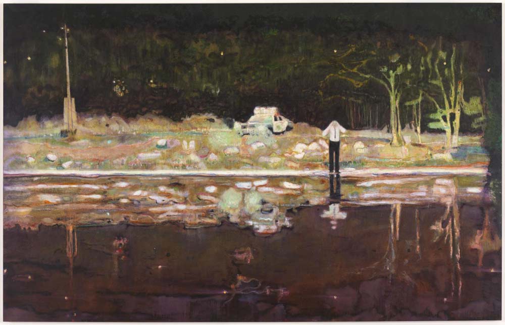 Fasciné par les espaces immenses où le rapport de l’homme à la nature est constamment en jeu, Peter Doig peint souvent des lieux sauvages, indéfinis, abandonnés, que l’homme traverse, laissant un signe de sa présence : canoës vides, maisons de travailleurs saisonniers, silhouettes solitaires devant des brumes flottantes.
