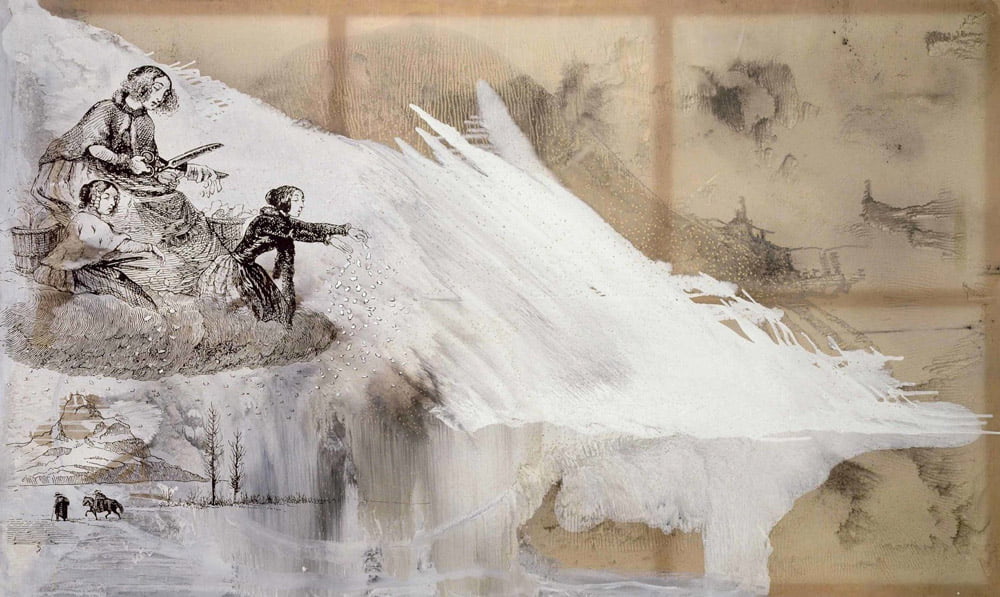 Le support traditionnel est souvent abandonné au profit de la toile à motifs imprimés. Il en assemble parfois plusieurs morceaux et cela peut constituer le l’essentiel et la raison d’être de l’œuvre : ce qui est habituellement caché apparait au grand jour. Il utilise aussi des voiles synthétiques transparents qui laissent visibles le châssis. Cette méthode révèle encore la démarche de l’artiste qui, sans jamais être démonstratif mais avec humour, se plait à révéler l’« envers du décor », et nous inviter à interroger le visible, ne pas évacuer ce qui le sous-tend. Des fragments de « récits » complexes utilisent souvent le médium photographique, ou la copie d’écran, mais manipulé au point que l’image est partiellement détruite rendue à une matière plus ou moins informe, et pourtant transposée en peinture bien souvent avec le plus grand soin. Ce récit fragmentaire est souvent implicite dans l’image multicouche, donnant l’effet de la projection d’hallucinations ou d’images de rêve sur une série de voiles superposés. mais l’« image » peut aussi n’apparaître que s’il y a un observateur pour la « réchauffer » avec une lampe électrique 5. Ou encore, c’est en travaillant des deux côtés de la toile en misant sur la transmigration lente du travail réalisé sur le dos de la toile vers la face. Ou en réalisant une peinture qui se métamorphose dans la lumière changeante de Venise, du matin au soir. Ici le temps nous est donné à voir comme un co-réalisateur de l’œuvre.